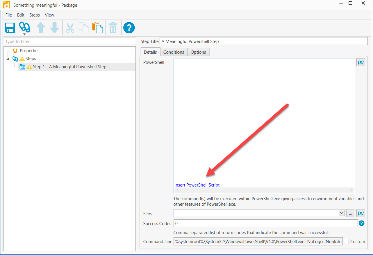 5. Add a PowerShell step and click "Insert PowerShell Script". Using this method, you can make your changes in the script and save it before deploying. The deployment will grab the script file you point it at each time it runs.