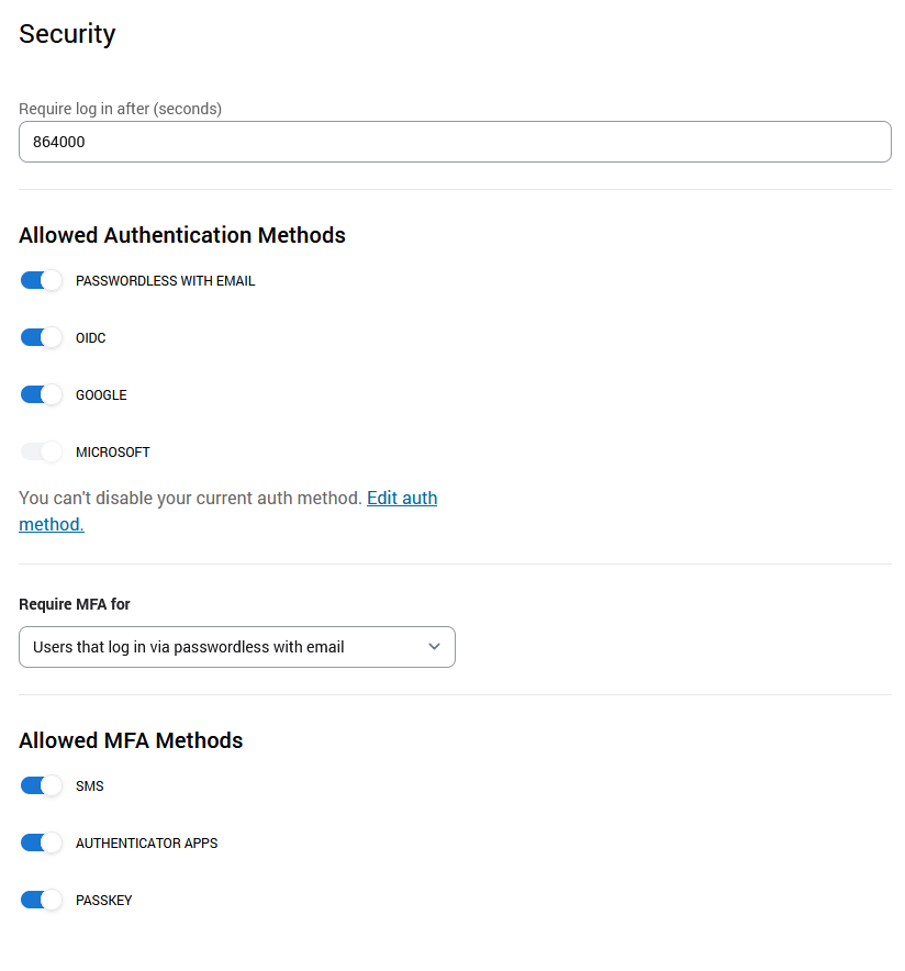 If you wish to disable Passwordless with email and no longer require MFA for your users, you will first have to enable an external sign-in method, such as Google or Microsoft Single-Sign-On (SSO), or OIDC through a supported identity provider.