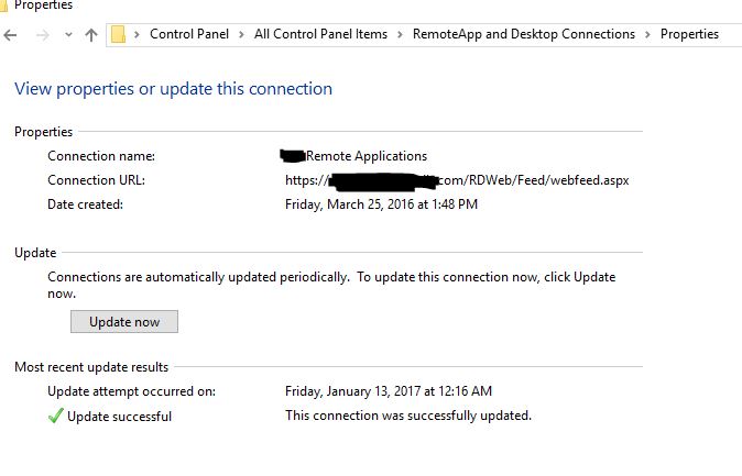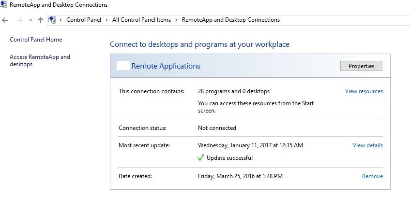 Does anyone know of a way to remove a Remote Apps profile from remote users machines? We have upgraded our remote apps server and have no issue pushing out the new connection but it is removing the old we are having an issue with. Essentially how do I remove and entry like the one in the attached photo.