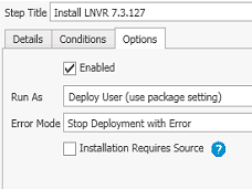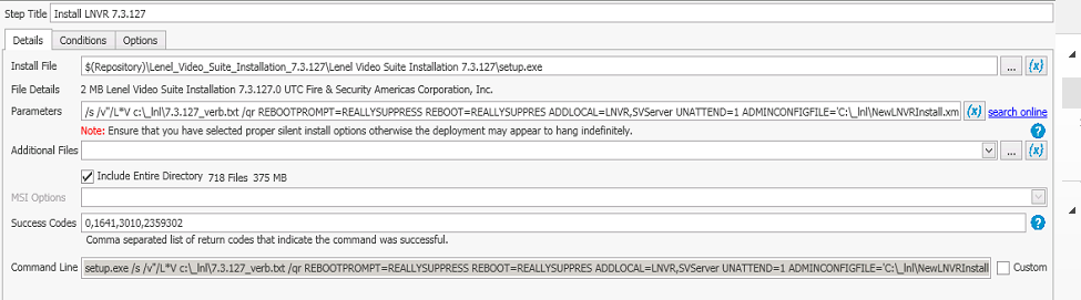 Here's the step in question. I make the XML config file the step prior and that completes successfully. Also using the parameters manually work with that same config file so I know the config file is correct. I didn't change anything with Conditions or Options but the screenshots are below.