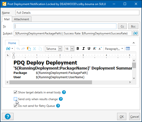 Not sure if I'm misunderstanding the logic though. I'm deploying alternating apps (Teamviewer Host and Teamviewer Client), so I'd expect to receive a status change when one is removed in favour of the other, even with the 'Send only when results change' ticked?