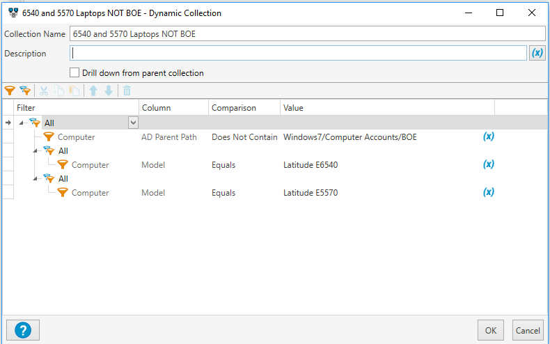 I have been trying to make a Dynamic Collection that contains 2 different model computers that do not come from a certain AD container. I created a Collection with a single model without a hitch, but when trying to add another model to the collection I have been unsuccessful. The Collection either returns empty or with all computers.