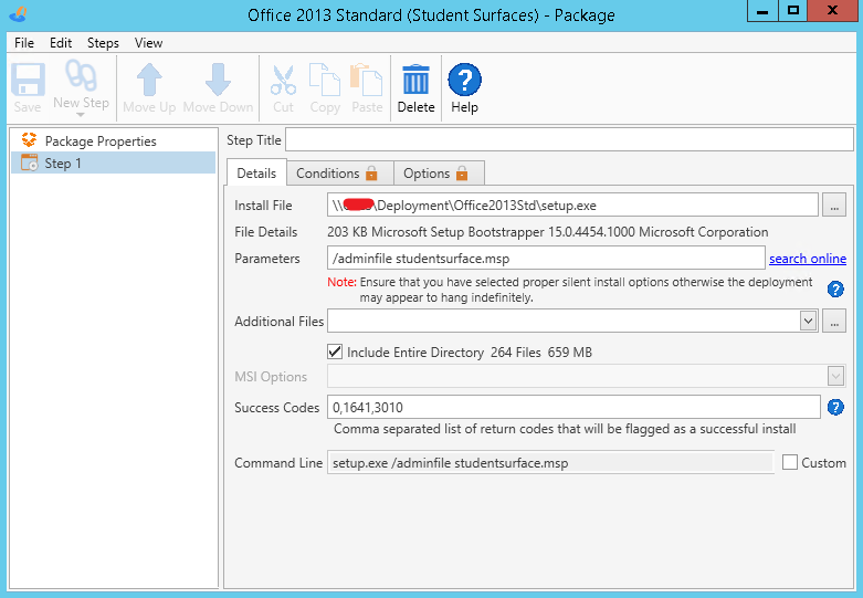 I'm attempting to deploy Office 2013 Standard (volume licensed product) to Windows 7 workstations with Office 2010 on them already. I've followed the Admin Arsenal knowledgebase instructions for OCT-based deployment of 2010, and watched the video for 2013, and even with (nearly) the exact same settings, my install stalls until timing out at the 1 hour mark.