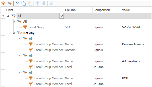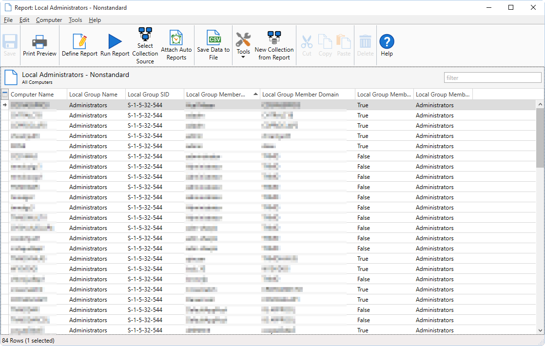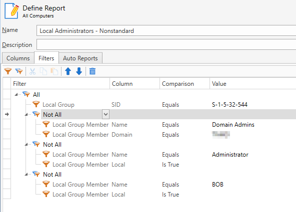 FYI, the report lists all computers and accounts that are in the built--in Administrators group (SID S-1-5-32-544) and are not MYDOMAIN\Domain Admins, built-in Administrator, nor local account "BOB".