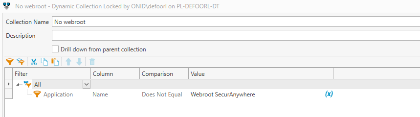 I am trying to create a Dynamic Filter off of all my computers for computers that DO NOT have our Anti Virus (WebRoot).