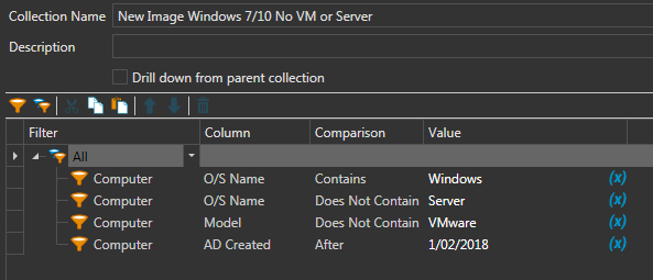 I am having an issue with a filter that I have setup based on what I have searched for online. I am looking for a filter that doesn't do any other O/S but Windows 7/10 and I don't want any VMware machines. I am also looking for it to see a computer that has joined the domain. The issue I come across with is if it has been joined to the domain previously, it doesn't show up in my list. Here is what I have: