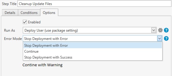 I was wondering if we could add under the stop options a setting for continue deployment with warning. I have a step to cleanup files after an update and it really does not warrant an error, it is more like a warning to go back and cleanup some files later. Thoughts?