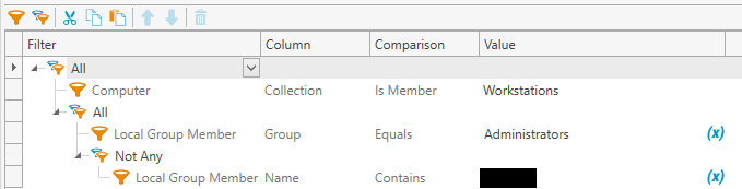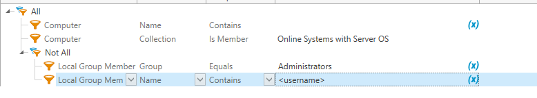 Thanks Ryan. Unfortunately removing the first filter and changing Not All to Not Any didn't do the trick. It is still returning systems with that specific user in the local admin group. I am specifically looking for systems that the user is not a local admin on. The user may exist on the system, but I only want to see systems where the user is not a local admin. There are other users and groups that are local admins, and that is fine.