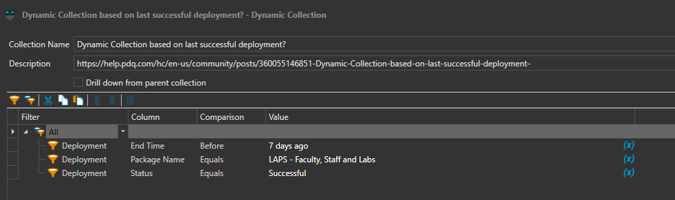 I'm trying to create a collection that lists computers that haven't had a particular PDQ Deploy package run in the last 7 days.