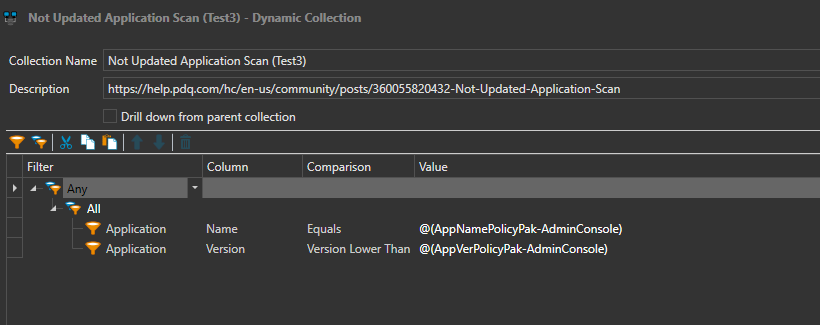 My logic for the group filters might be unnecessary, but after years of using PDQ I have found it to work pretty well for me and helps me to keep it logically organized. Basically, the first "Any" group filter is saying look for "Any" application, and the second "All" group filter is saying look for "All" of these value filters on that one application.