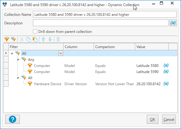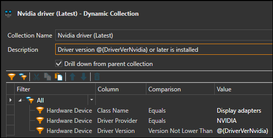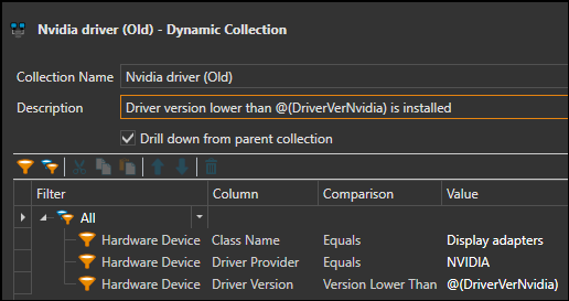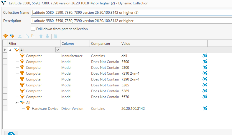 The other thing is, I can filter by the driver version for the video driver for computers that contain that driver but I can't get a list of computers that don't have the driver as well. So I'm trying to make two collections ideally, one that has the 4 models and is lower than the current driver and then another collection that has the same 4 models and is equal to the current driver.