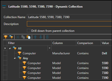 I am trying to use a dynamic collection to isolate 4 models of computers out of 11 we have in production. And then I want to see if the 4 models have the latest video driver (since they all use the same driver). The only way I can get it to work is by having a bunch of filters of all the models I don't want. If I try to do a "Contains 5580" new line "Contains 5590" I get no results.