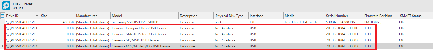 The attached picture shows the SD card reader in the 'Disk Drives' before it was unplugged from the mainboard.