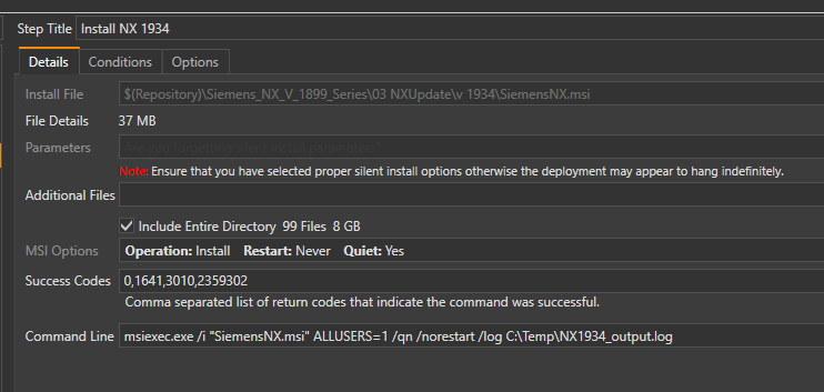 if i put it in a command step it won't install. In MS Eventlog i get the error: Product: Siemens NX 12.0.2 -- Error 1606. Could not access network location "C:\UGS\NX12".
