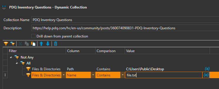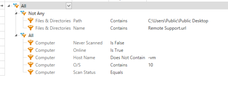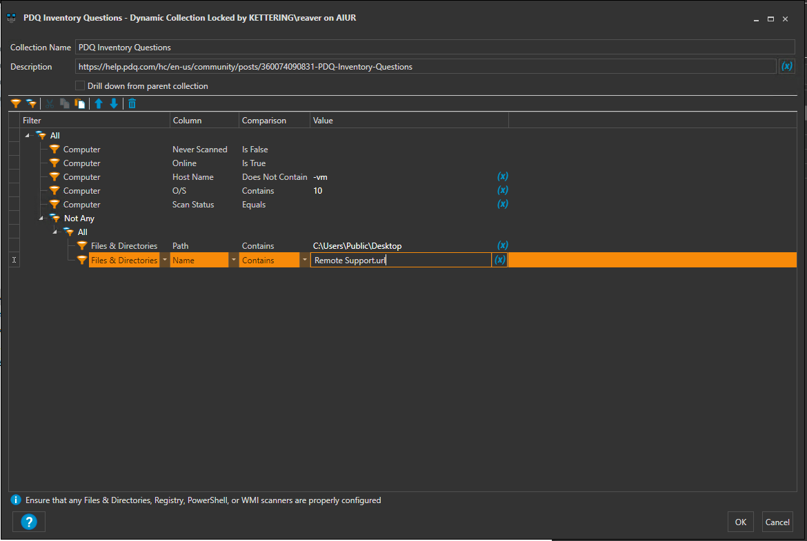 So I have created a scan profile to scan the users\public\desktop directory. So after that scan I want to create a collection for pc's that don't have a url in that directory I scanned. I might be overthinking this. My collection would then be not any > files and directory > ....Url. Has anyone done something like this. I am not sure I am on the right path.