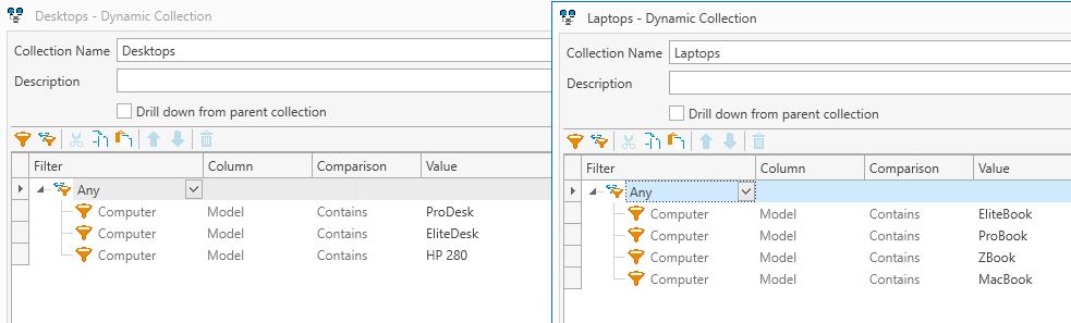 We have dynamic groups set up for computer models. The laptops group works great but for some reason no computers get added to the desktop group. We have these groups configured exactly the same way, as shown below. Am I missing something?
