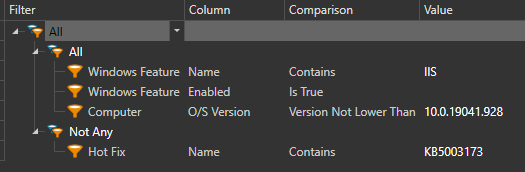 So this is the filter posted about the new IIS CVE except it leaves behind patched machines in the collection so I tried adding the hot fix KB to it so it would be removed from the collection...