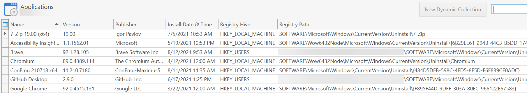 The Registry Hive and Registry Path fields show where Inventory found that application's entry.