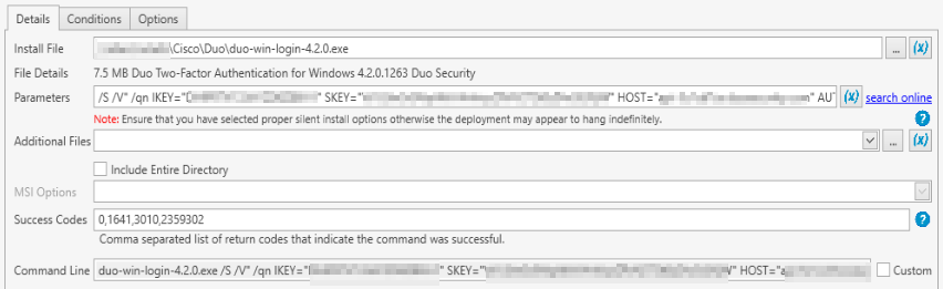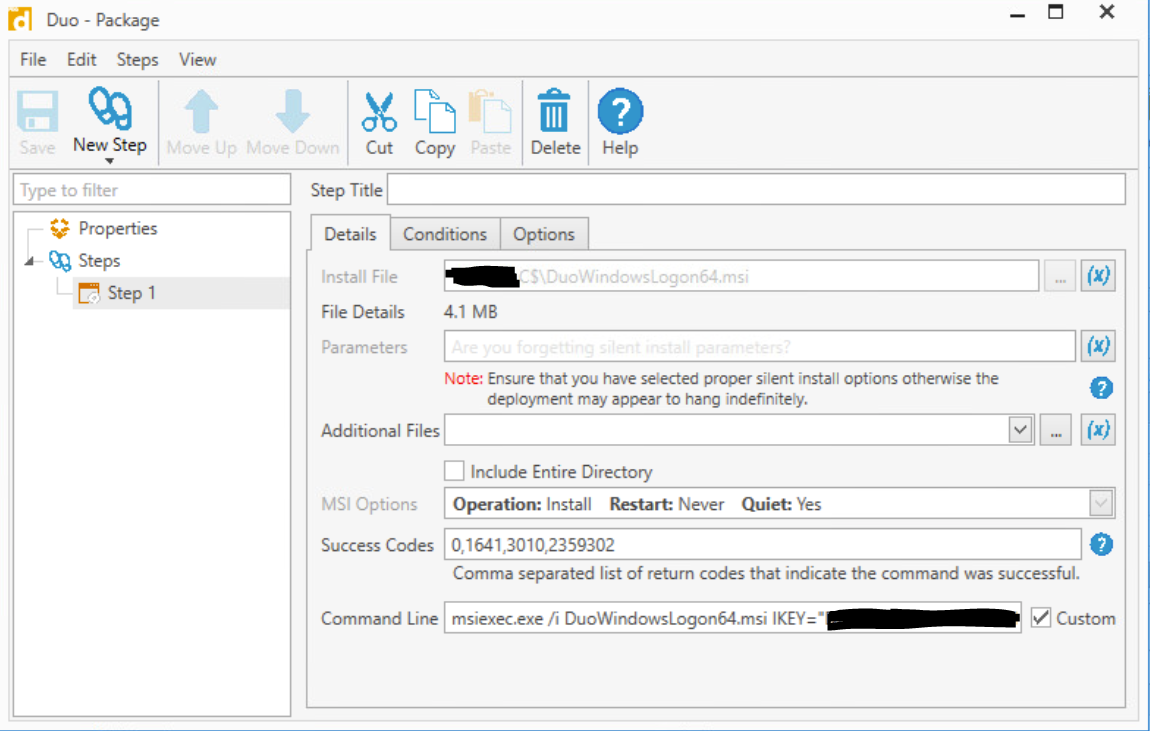 I've also added a New Step --> Command and copied/paste the exact string from Duo's site and that didn't work as well. I've also tried installing the .exe file and that didn't work to. I've also changed the "Install File" from a shared drive to the local machine and that didn't work to.